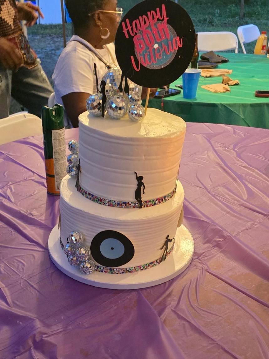 This listing is for 1 x Vinyl Record Themed Birthday Cake Topper Personalised with a name and age as shown in the photos, attached to a skewer. Supplied in a choice of colours - please see photos.
