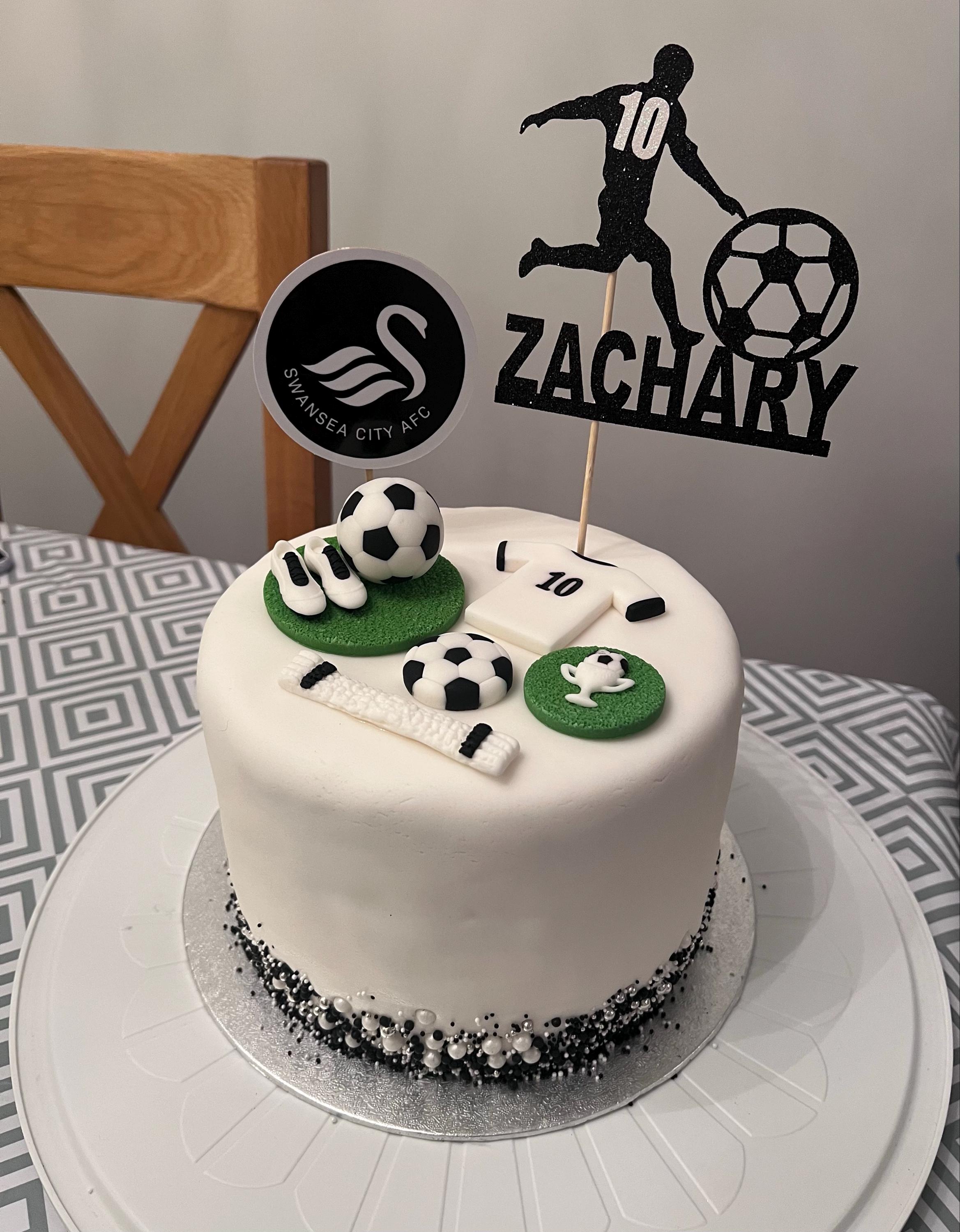 This listing is for a Footballer themed Glitter Cake Topper, personalised with a name and age of your choice, as in photograph.