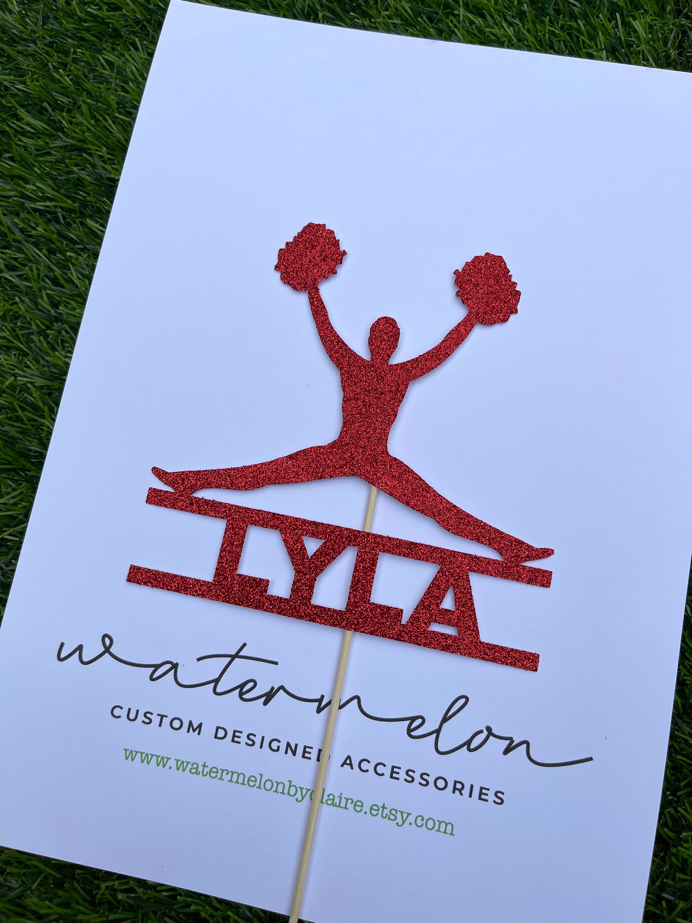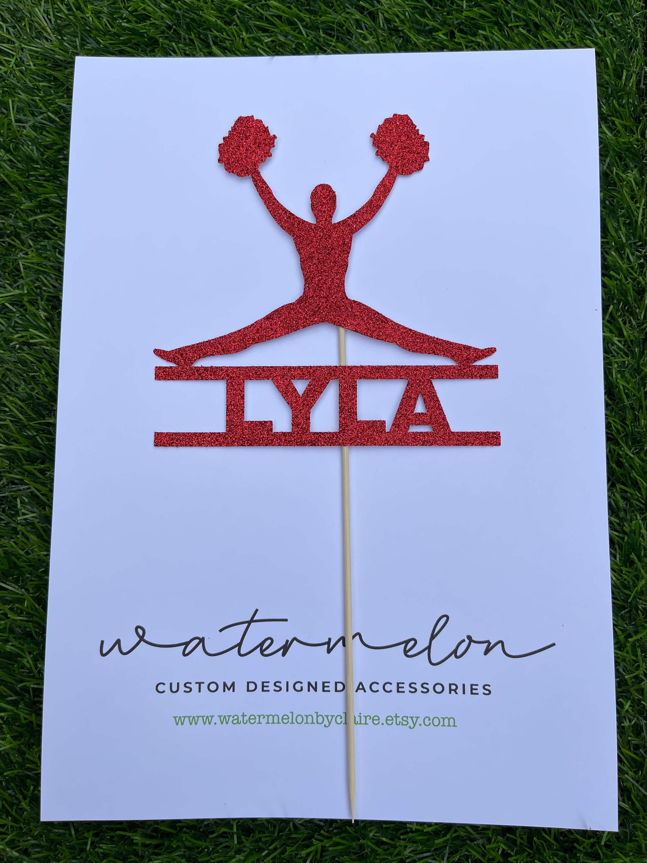 This listing is for 1 x Personalised 'Cheerleader' Cake Topper, in a choice of colours with a name of your choice, attached to a food safe skewer.