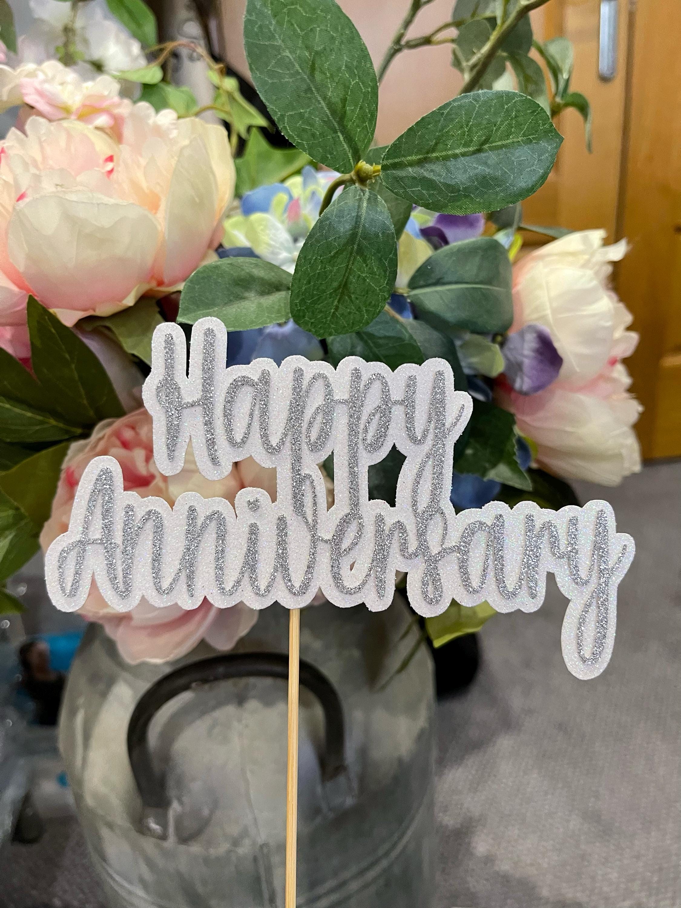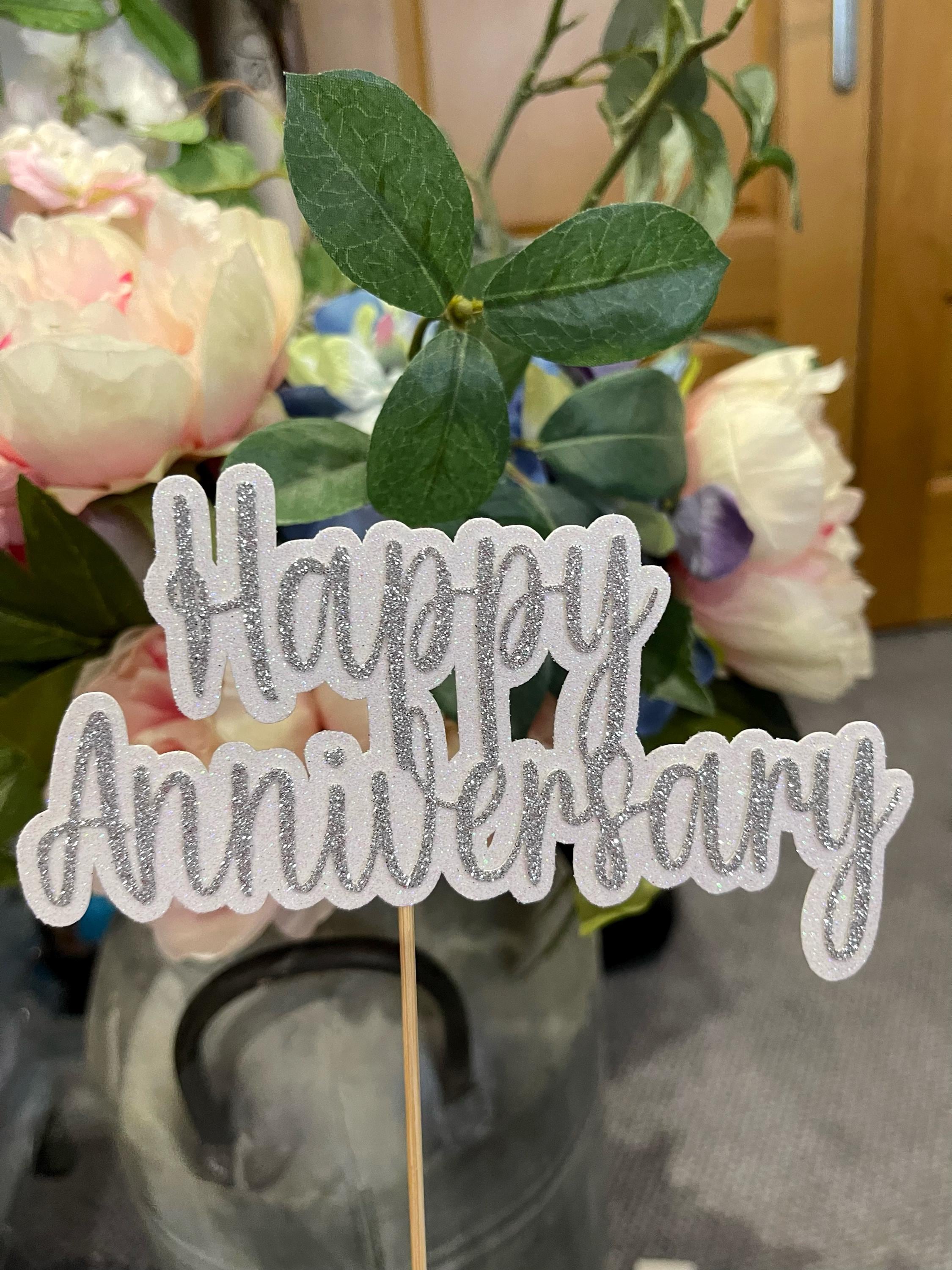 This listing is for 1 x 'Happy Anniversary' double layer glitter cake topper, in a colour of your choice, mounted onto a white background.
