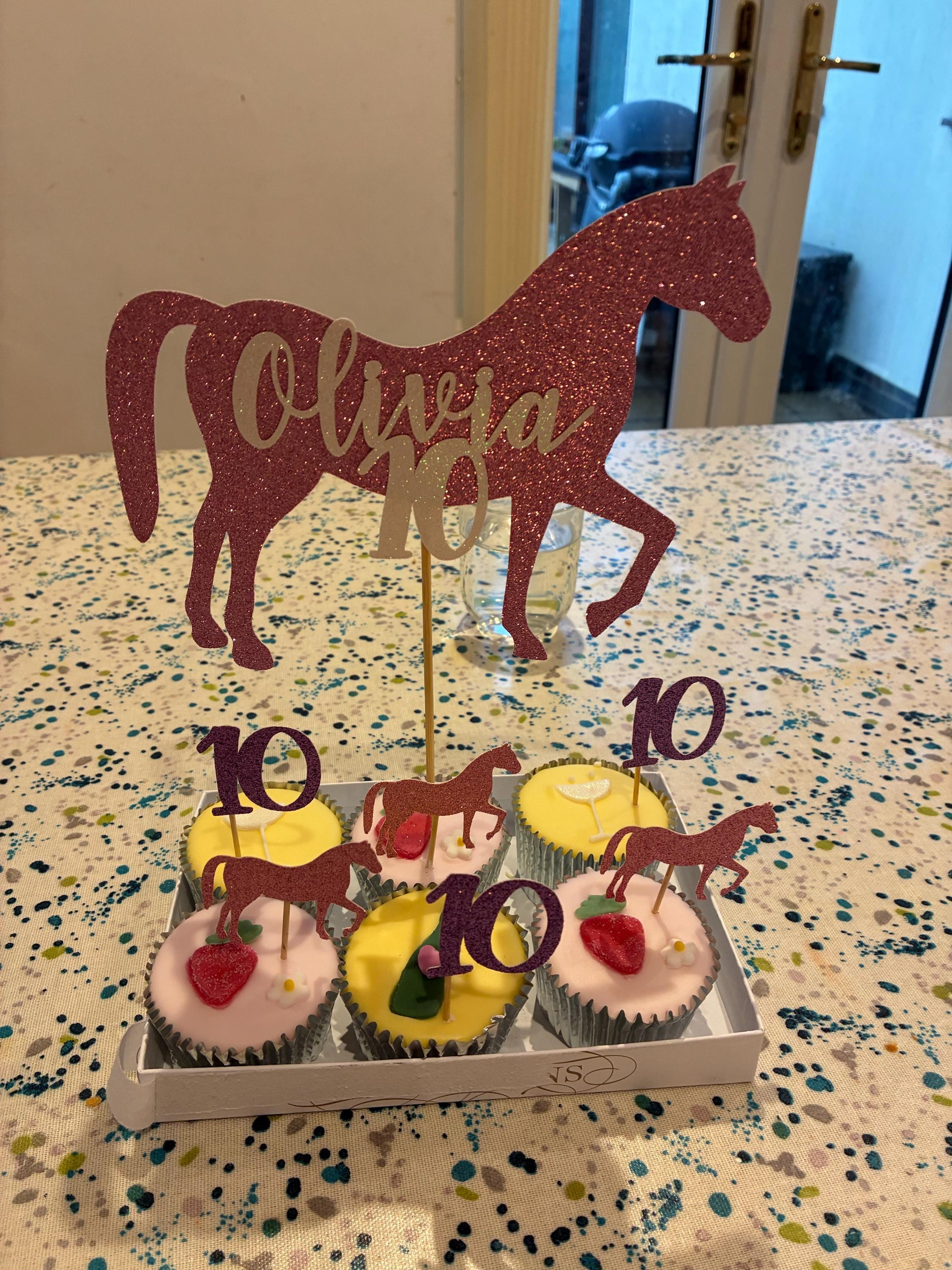 This listing is for 1 x Personalised 'Horse' Glitter Cake Topper, in glitter card colour of your choice with a name and age of your choice in WHITE glitter.